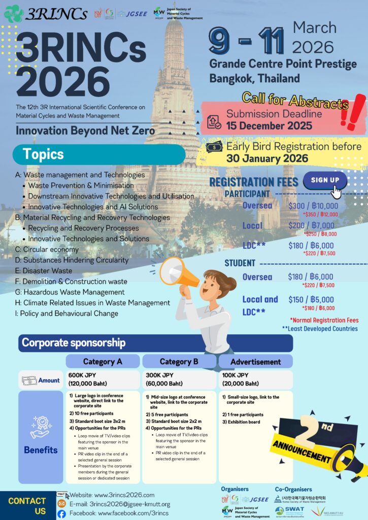 The 3RINCs (The 3R International Scientific Conference on Material Cycles and Waste Management) has been held annually in Asia and Oceania since the first 3RINCs 2014 in Kyoto, Japan, bringing together experts and stakeholders from around the world. The 3RINCs have successfully brought together experts and stakeholders from all over the world in countries in Asia and Oceania, and have been used as a forum for sharing the latest scientific knowledge and research results on material cycles and waste management from the perspective of the 3Rs, resource recycling and circular economy, as well as information on policies, private sector technology development, NGO activities, etc. In recent years, in particular, efforts to address global challenges such as climate change and marine plastic pollution have become increasingly active, and unique research and activities are being promoted. 3RINCs play the role of a ‘platform’ where stakeholders from all over the world can gather and consolidate this latest knowledge and technology, as well as the 3RINCs play a role in consolidating this latest knowledge and technology, as well as in strengthening the networks among the parties involved.